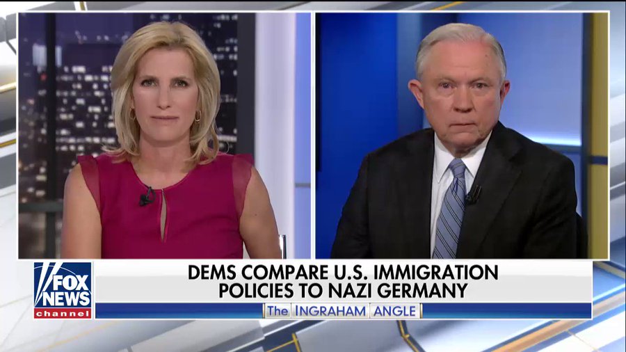 But, my God, nothing could prepare us for what came next on Ingraham’s show. Attorney General Jeff Sessions joined Ingraham to beat back the growing, legitimate comparisons between the concentration camps of Germany and these border facilities and the indefinite lock-up of migrants. Hitler whipped up nationalism using many of these same techniques, scapegoating Jewish people and immigrants. So, how did Sessions bat down these comparisons? By claiming they are nothing like the Nazis because Hitler wouldn’t let the Jews leave Germany. See? Tooooootally different. Watch: